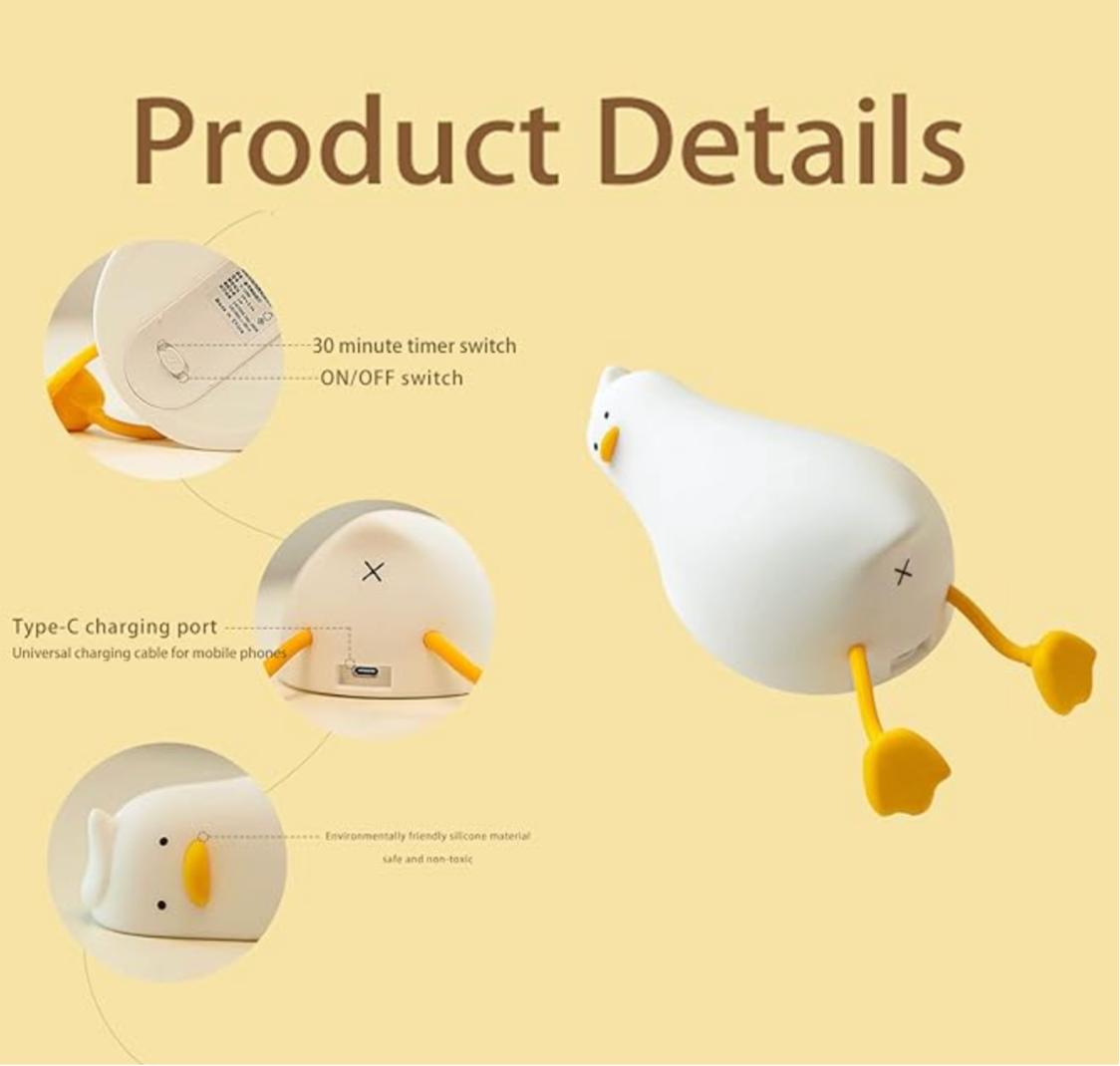 The duck night light features three adjustable brightness settings and automatically powers down after 30 minutes. Ideal for reading or providing soft illumination, you can effortlessly tailor the light’s intensity by tapping it to select your preferred ambiance.
